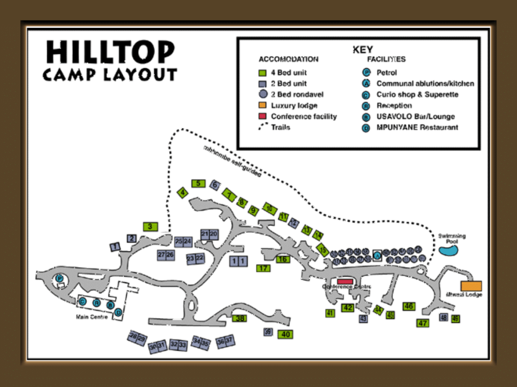 For self-catering, there are two-bedded rondavels (round huts) with communal ablutions and kitchens plus 7 two-bedded and 22 four-bedded chalets with their own bathrooms. Another 20 two-bedded chalets are close to the main reception area and are on a bed and breakfast or dinner, bed and breakfast basis..