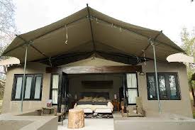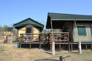 No air-conditioning but rather fans and all have mosquito nets. All are thatched with high ceilings, so keep cool. Serviced daily. Facilities include a memorabilia filled lounge, game viewing deck, restaurant and bar, swimming pool, laundromat, gift shop, convenience store, conference facilities, and petrol. WiFi is available but patchy.
